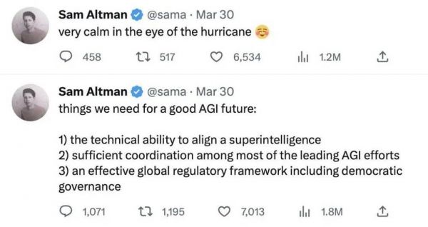 生命研究所的公开信将 OpenAI 拉入了舆论的风暴之中,OpenAI 的 CEO Sam Altman 在 Twitter 上却表示他依然很平静,并提出了建立 AGI(通用人工智能)的三个要点。