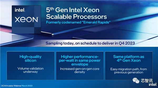 目前,第五代Emerald Rapids现在已经出样,正在进行批量验证,将在今年第四季度按期交付。它依然延续现有的Intel 7制造工艺,架构上也不会有本质的变化,重点是增加核心数量、提升能效。封装接口也延续LGA4677,现有平台可以无缝升级。