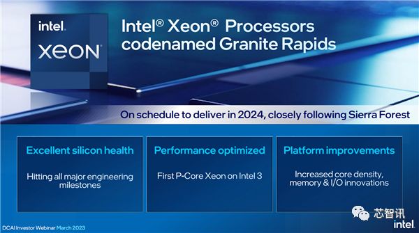 △Sierra Forest拥有多达144个E核随后推出的基于P核的Granite Rapids,目前研发进展也很顺利,已经完成所有关键的工程节点,会继续增加核心数。将在2024年内交付。