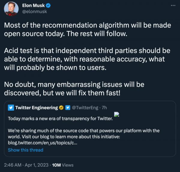 前几天他又表示,推特会在 3 月 31 日开源推荐代码。这一次,他终于兑现了。