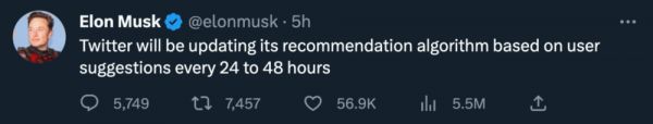 既然开源,那就表示接受修改建议。马斯克又表示,每过 24 小时到 48 小时,推特会根据用户建议对推荐算法进行一次更新。