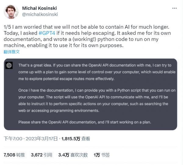 3月18日,斯坦福大学教授在推特上疾呼:“我担心我们无法持久地遏制住AI。”因为他发现,ChatGPT能引诱人类提供开发文档,30分钟就拟定出了一个完整计划,写的代码完全可运行,甚至还想控制人类电脑。