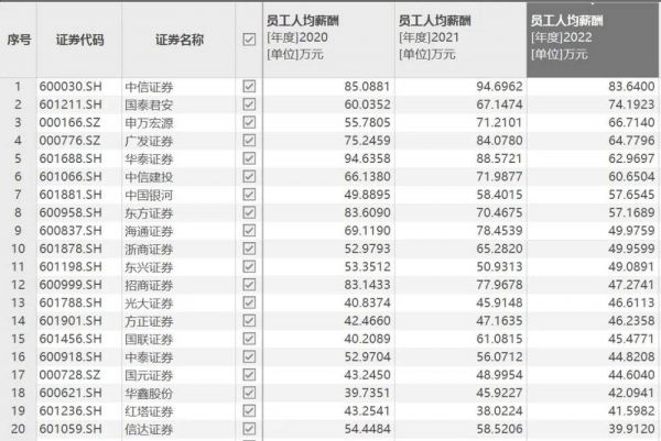 东财受限于取数仅为外部资料,可能与公司计算数据有所差异。如浙商证券在年报中指出,报告期内,浙商证券定期发放固定薪酬,并根据绩效考核情况,计算各年考核奖金、绩效工资等,在财务系统中相应计提了递延发放的部分,2022年公司人均薪酬为35.89万元,较上年下降33.7%。