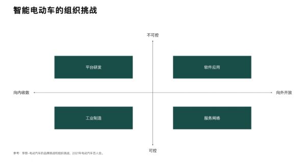 李想认为理想汽车有两个最重要的产品:一是面向消费者的智能电动车产品,另一个则是面向员工的组织能力。作为一家刚进入汽车行业的企业,理想同时要变成四类不同的企业,而且这四类不同的企业,所面对的问题复杂程度也是完全不一样的。