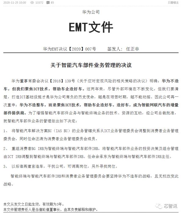值得一提的是,早在2020年,任正非就曾签署了一份名为《关于智能汽车部件业务管理的决议》,称“华为不造车”,并严厉表示“以后谁再建言造车,干扰公司,可调离岗位,另外寻找岗位”。该文件从发文之日起生效,有效期为3年。