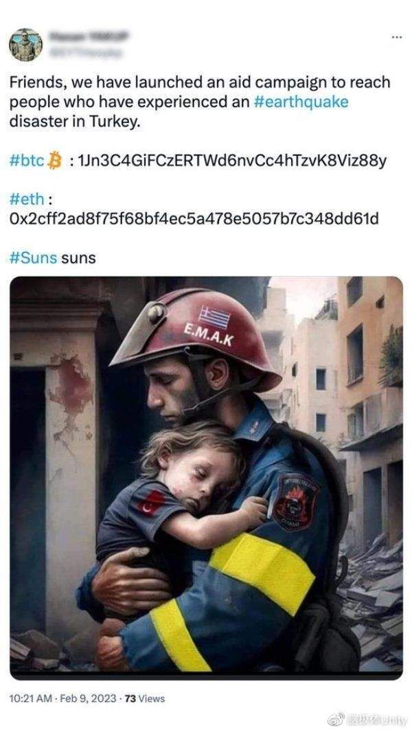 比如最著名的是,一个骗子在推特上反复分享呼救信息,并附上了一名消防员拯救孩子的照片,以及自己的加密货币钱包链接,很多不了解真实情况的歪果群众,心碎之余马上打钱,但也有眼尖者发现,这个图片怎么一股AIGC的味道?