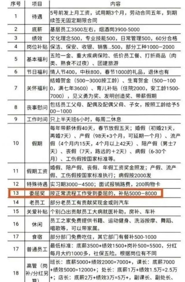 你听说过“委屈奖”吗?据报道,河南许昌一企业的薪资待遇图在网上流传,其显示为员工设置了“委屈奖”。企业回应称,针对员工因制止不文明行为被投诉,或被辱骂、恐吓,公司确实设有“委屈奖”。不过,具体奖励金额并非网传的5000元至8000元,而是根据不同情况,奖金在500元到5000元不等。