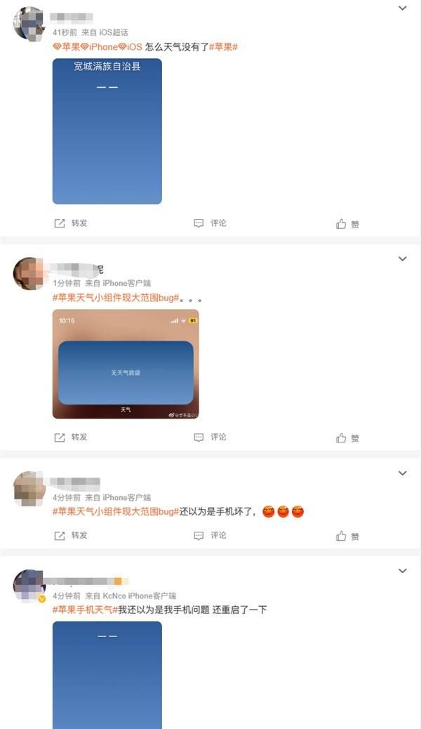 iPhone近日出现了大面积BUG,iPhone上自带的天气App崩了,覆盖范围极广,几乎身边每一位用户都出现了。