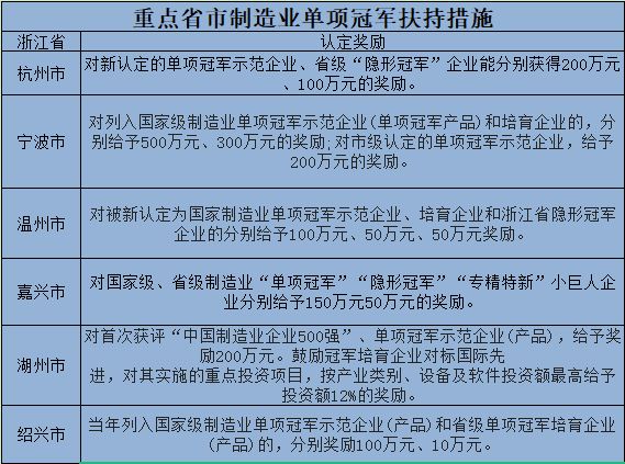 最“土豪”的深圳市,对国家级单项冠军企业的奖励是300万,而宁波对列入国家级单项冠军企业和培育企业,分别奖励500万元和300万元;对市级单项冠军,奖励200万元。
