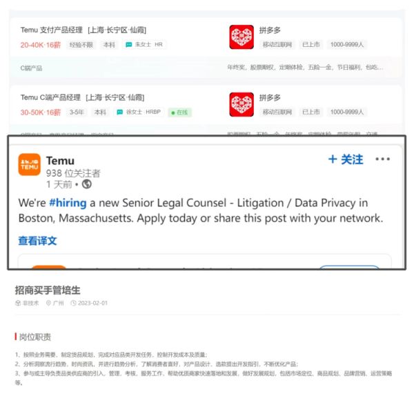 图源:BOSS直聘、LinkedIn、拼多多校园招聘官网有消息称,开通新的市场使得Temu团队人数随之增长,到3月中旬从1200人(今年1月人数)规模增长至约1500人。从现有招聘信息来看,这支团体或许需要更多人才。