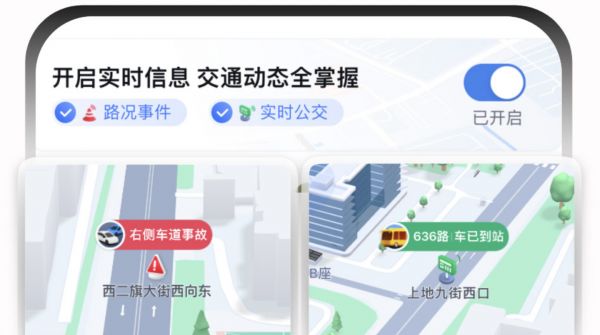 事故拥堵、公交到站等信息,地图首页实时可见。实时红绿灯倒计时,每天提供超 10 亿次读秒提醒。