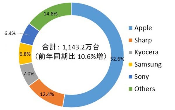 根据了解到的数据,2020年第四季度,苹果在日本市场的出货量为601.5万部,同比增长13.8%,市场份额高达52.6%。此外,夏普、富士通、三星和京瓷等日本本土品牌也占有一定的市场份额。