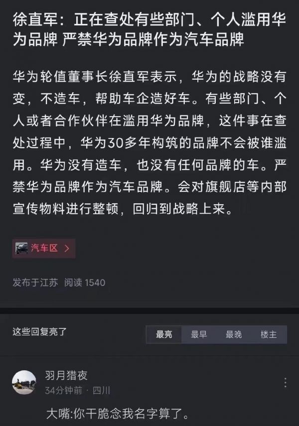 关于任正非重申华为不造车的事,华为轮值董事长徐直军在 2022 年年报发布会上回应说,不允许滥用华为品牌,要整顿线下门店的物料。这也就意味着此前华为大费周章宣传的“HUAWEI 问界”汽车将成为历史,此后只有“AITO 问界”。