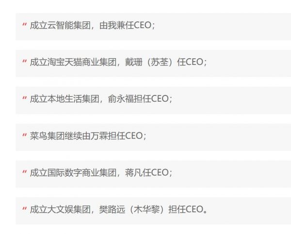 成立云智能集团,由张勇兼任CEO;成立淘宝天猫商业集团,戴珊(苏荃)任CEO;成立本地生活集团,俞永福担任CEO;菜鸟集团继续由万霖担任CEO;成立国际数字商业集团,蒋凡任CEO;成立大文娱集团,樊路远(木华黎)担任CEO。此外,其他具备条件的业务组织将设立多家业务公司,全面实行公司化管理。