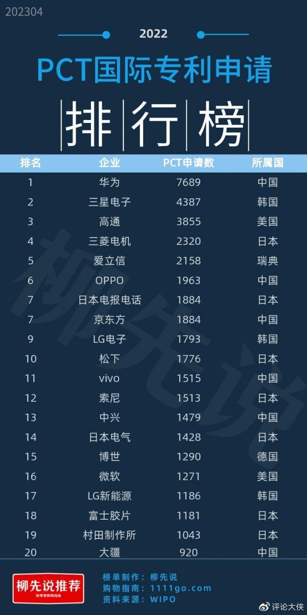 PCT国际专利申请排行榜第1名是华为,国际专利申请7689件。华为是全球排名靠前的ICT基础设施和智能终端提供商,去年研发费用总额达到1615亿人民币,研发费用率为25.1%,处于历史高位。服务全球人口超过30亿,企业十年累计投入的研发费用接近万亿,达9773亿人民币。