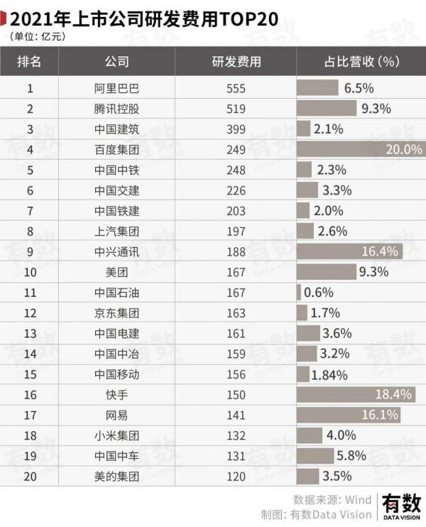 上市公司的财报中,有一项名为研发费用的成本专门用来记录一个时间周期内,公司在研发方面的投入。如果以该指标为衡量标准,中国上市公司中研发费用最高的三家分别是阿里、腾讯以及中国建筑。