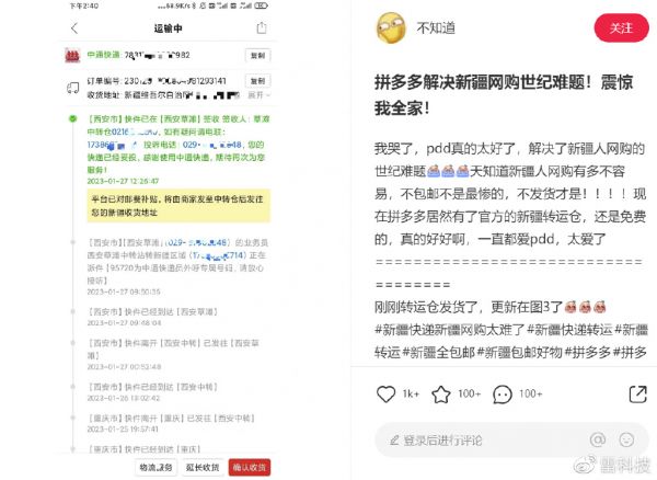在小红书社区上,就有用户指出,新疆消费者的网购体验一直没有受到其他电商平台太多关注,不仅邮费高不包邮,很多商家还会刻意拖着不发货。拼多多则通过官方的新疆转运仓集运,其中的邮费也由平台进行补贴,消费者一侧还是零邮费。