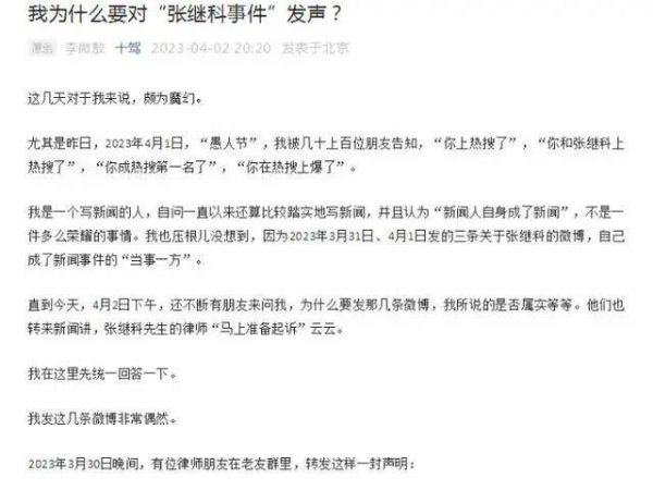 4月2日晚,“张继科事件”爆料人——经济观察报记者李微敖通过其个人微信公众号发表题为《我为什么要对“张继科事件”发声?》文章,回应网上部分质疑,该事件再次冲上热搜。