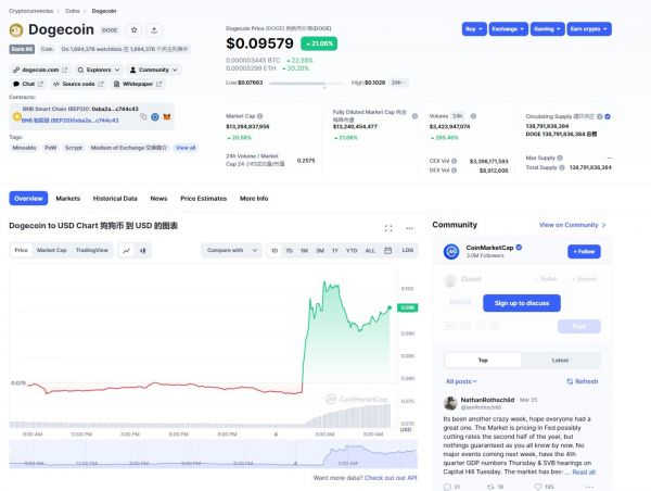 当前 CoinMarketCap 排名第 8,实时市值为 13148853642 美元。它的流通供应量为 138791836384 枚 DOGE 硬币,最大数量为 138791836384。
