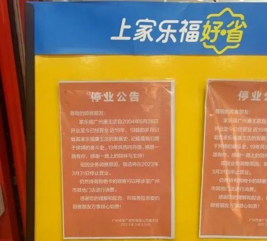 3月30日,广州市家广超市有限公司康王店发出告示,称家乐福广州康王店在3月31日停止营业,持有购物卡的顾客可以去广州市其他门店进行消费。