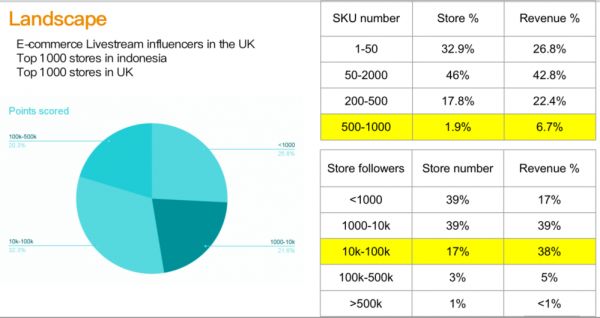 从数据上来看,直播电商卖家在英国头部的前1000家卖家,Sku数量仍集中在1~2000个之间。占到了78.9%。而78%店铺的粉丝量不到1万人。一万到10万人左右的中等粉丝量是主要的收入贡献者。