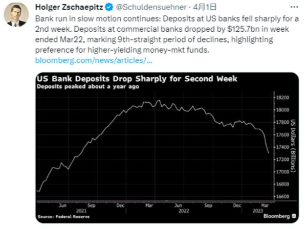 数据显示,截至3月22日的一周内,美国所有商业银行的存款规模再度减少了1257亿美元,为连续第九周下滑。不过,这一数字比硅谷银行和签名银行倒闭后第一周创纪录的1745亿美元存款流出幅度,已减少了约500亿美元。