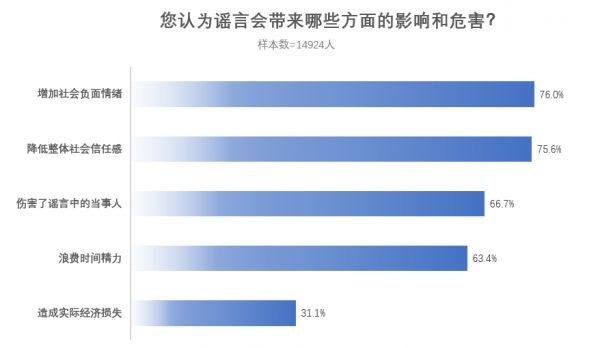 调研还显示,当前内容资讯领域存在很多的虚假、低质和占用用户时间的不实信息,不仅会误导用户,占用用户大量的时间,还会降低用户的生活质量,使大众产生负面的社会情绪(76.0%)和对社会的不信任感(75.6%)。