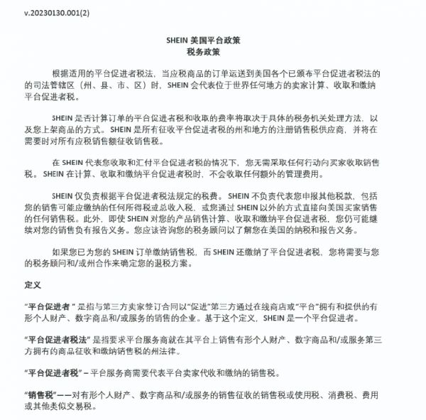 SHEIN确实重视海外经营的合规性,尤其是美国市场,比如其招商的协议规则中,最新一条就是对美国的平台促进者税法进行说明。