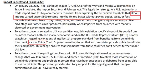 该法案洋洋洒洒上万字,指向性却极强,其中第三条“进口安全和公平法”明确规定,如果商品来自非市场经济地位国家,或知识产权优先观察名单,将不能享受“800美元进口免税额”。