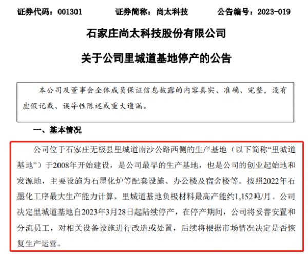 尚太科技关于公司里城道基地停产的公告 | 图源公告截图