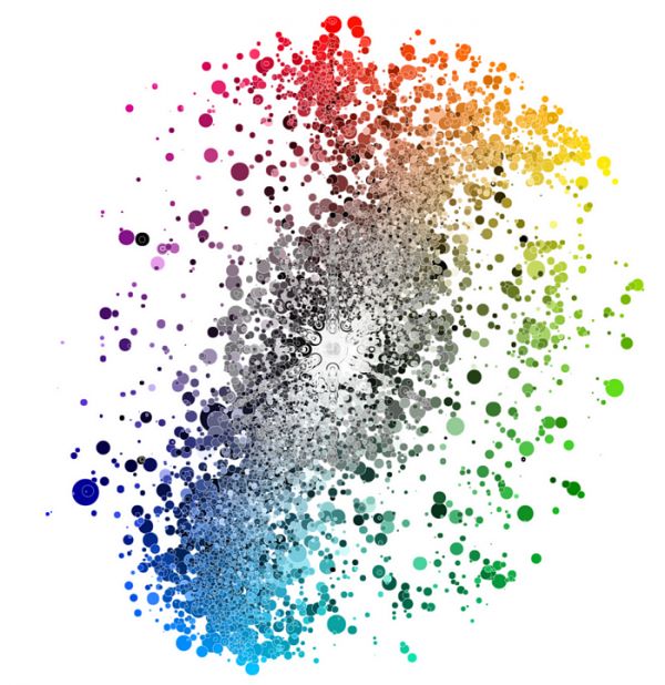 而对于这上千个网站的配色进行整体分析生成下图所示的可视化数据,其中圆点的尺寸代表相应颜色在配色板上出现的数量,角度是色调,到中心的距离是有亮度校正的饱和度数值。