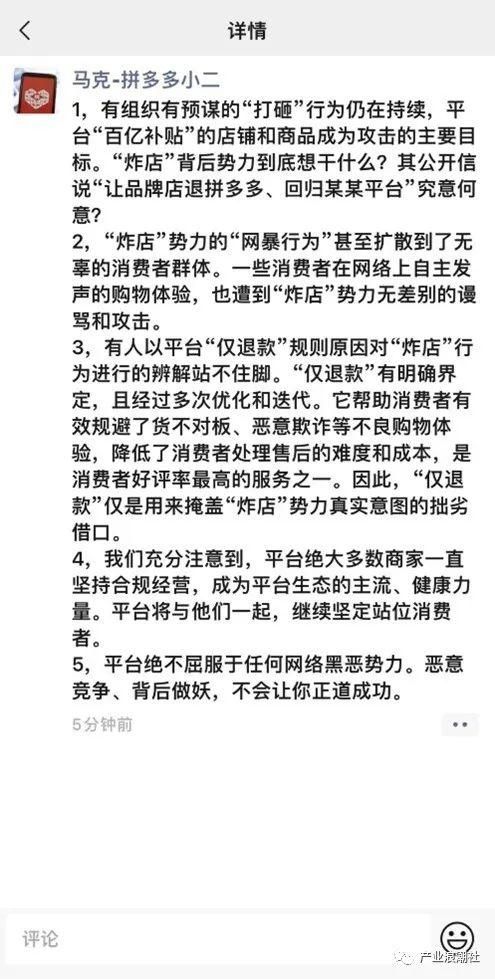 4 月 3 日,拼多多店小二 " 马克 " 在朋友圈怒斥 " 炸店 " 行为。他称目前有组织有预谋的 " 打砸 " 行为仍在持续,平台 " 百亿补贴 " 的店铺和商品成为攻击的主要目标。拼多多的消费者也开始受到 " 网暴行为 " 的波及。
