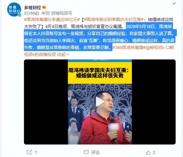 大家也知道胡欢和周鸿祎当初也是非常恩爱的一对夫妻,在2020年5月18日的时候互联网大佬周鸿祎曾分享自己的婚姻经验,称家里大事男人说了算。他还谈到当当创始人李国庆,俞渝“互撕”,称觉得很痛心,婚姻做成这样,真的很失败,婚姻是非常难熬的事情,非常需要忍耐。没想到他也走到了今天的这个地步,不过两人分手也都是协商分手的,对他们双方应该没有任何影响。