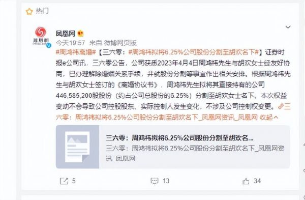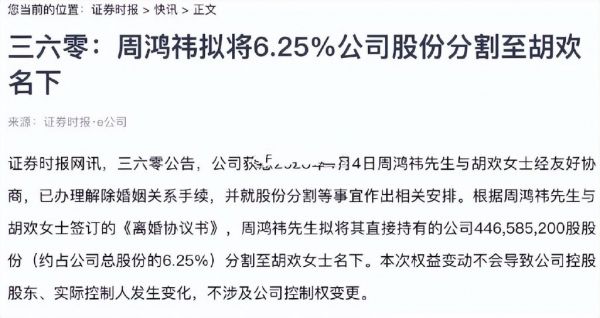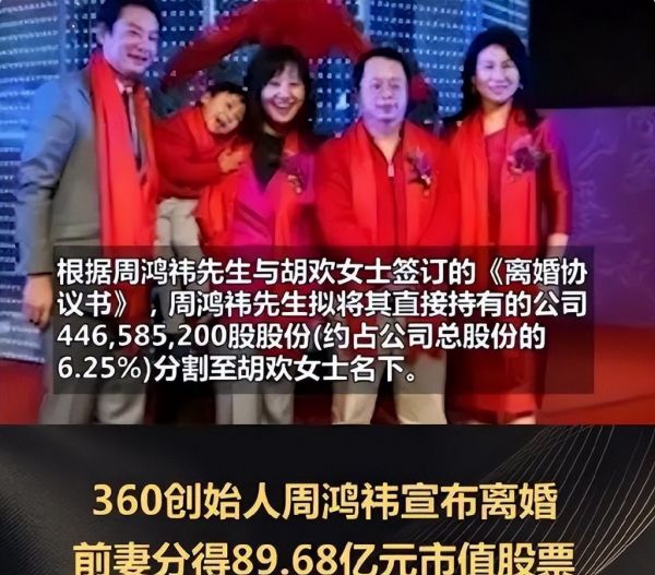 除了胡欢和周鸿祎离婚的消息之外,阔太胡欢还获得了90亿的分手费,据360发公告称周鸿祎将自己直接持有的4.465亿股(约占公司总股份的6.25%)分割至胡欢名下,按今天的收盘价(每股20.08)来算,价值约90亿。还有网友听到这个字眼也不仅反驳:好像女方占了多大便宜似的,结婚以后都是夫妻共同财产,离婚就该进行财产分割,什么分手费,这是女方应得的。
