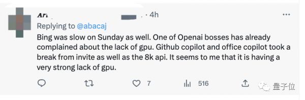 另外在微软那边,有网友发现,Bing在周日的时候也很慢。而OpenAI联合创始人也抱怨过GPU不够。归根结底,非常缺GPU。