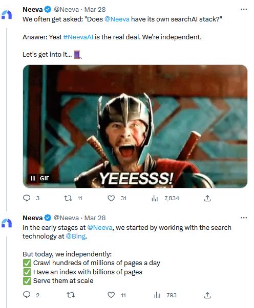 3月28日,Neeva官方账号在推特发布消息:“经常有人问我们,Neeva有自己的搜索堆栈吗?答案是:是的!我们是玩真格的。我们是独立的。”