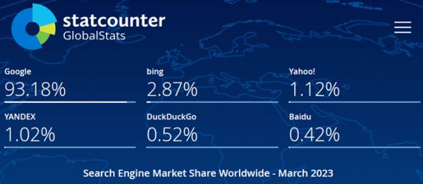 根据Statcounter数据,在刚刚过去的3月,必应的全球搜索引擎市场份额只有2.87%,这个数字和2月的2.88%相比几乎持平;而谷歌的市场份额为93.18%,也与2月的98.17%相比几乎没有变化。其他维度如桌面端市场份额、美国市场份额,也是类似的情况。