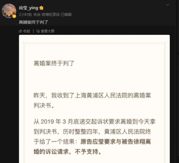 2023年4月5日,徐翔妻子应莹发文称,离婚案终于判了,她于4月4日收到了上海黄浦区人民法院的离婚案判决书,法院对她的离婚诉讼请求不予支持。应莹不服,并表示将依法向上海第二中级人民法院提起上诉。