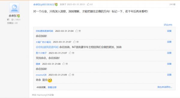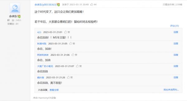 2023 年 3 月 31 日晚,华为消费者业务 CEO 余承东在帖子下留言:“这个时代变了,这只会让我们更加艰难!若干年后,大家都会看明白的!留给时间去检验吧!”“对一个行业,只有深入洞察,深刻理解,才能把握住正确的方向!标记一下,若干年后再来看吧!”