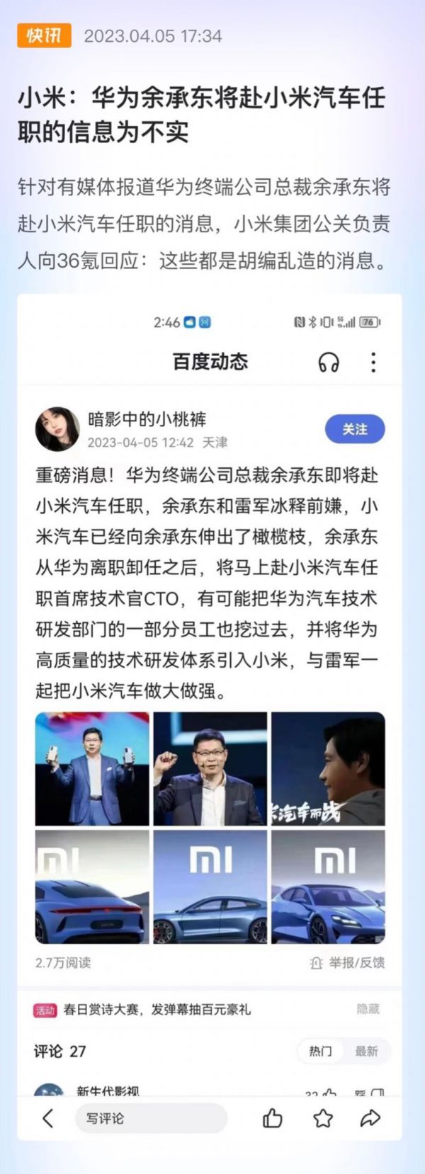小米:胡编乱造,华为余承东将赴小米汽车任职的信息为不实