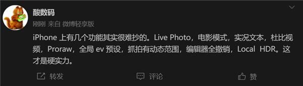 来自一加的高管@酸数码就总结了iPhone手机的几个特别之处,主要有LivePhoto,电影模式,实况文本,杜比视频,Proraw,全局ev预设,抓拍有动态范围,编辑器全撤销,LocalHDR,也就是9个功能是安卓做不到或者做不好的,这是苹果的硬实力。