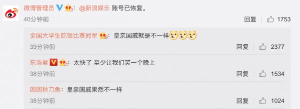 在短暂“销号”后,约晚间10时50分左右,“新浪娱乐”账号恢复。