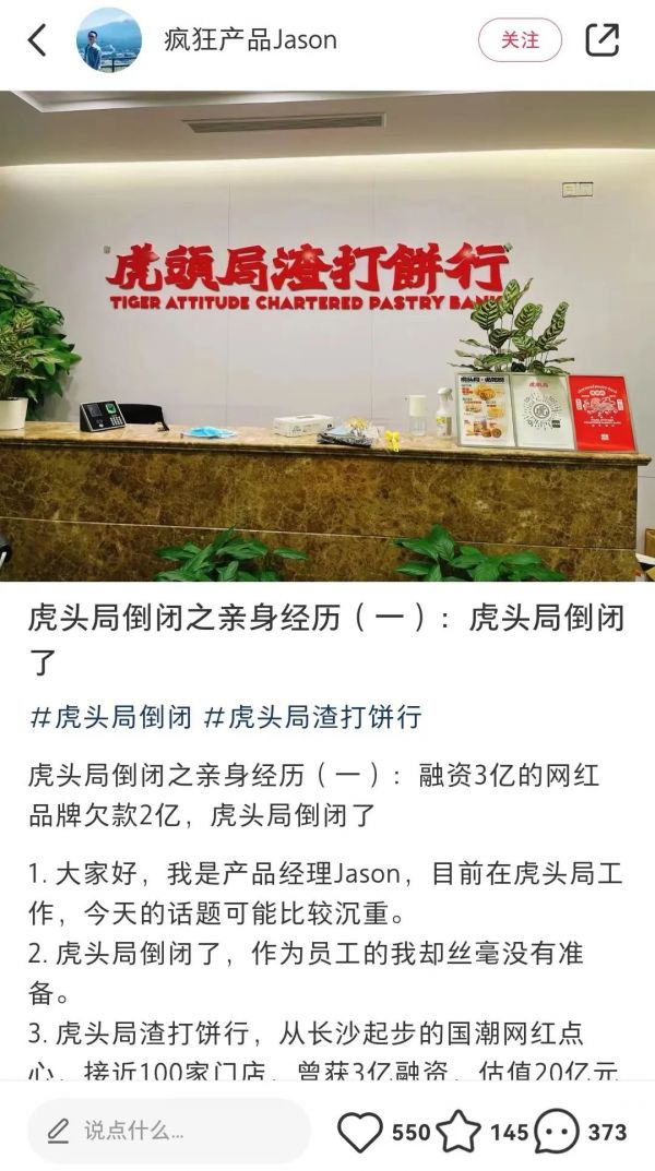 3月30日,自称是前互联网产品经理、虎头局员工的网友Jason在抖音爆料,从长沙起步的国潮网红点心虎头局渣打饼行,马上要倒闭了。