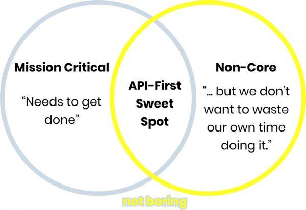强大的 API-First 企业正好处于这个甜点位置:它们向客户提供重要但非核心的功能,例如接受付款,提供云安全或向客户发送通信。