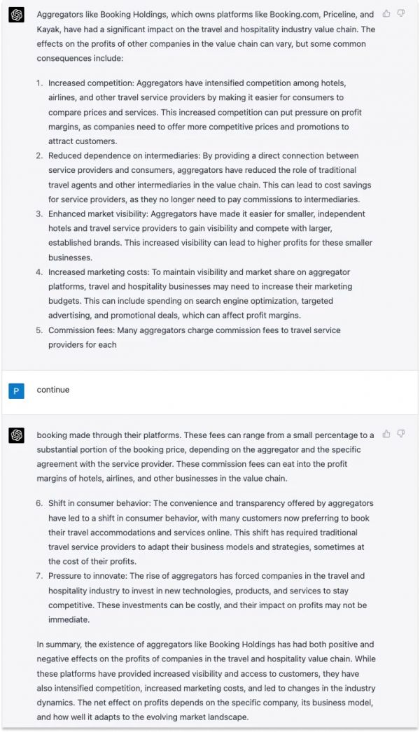 你可能明白我要说什么。我问 ChatGPT 像 Booking Holdings 这样的平台组合对其他旅游和酒店价值链中的公司利润有什么影响。