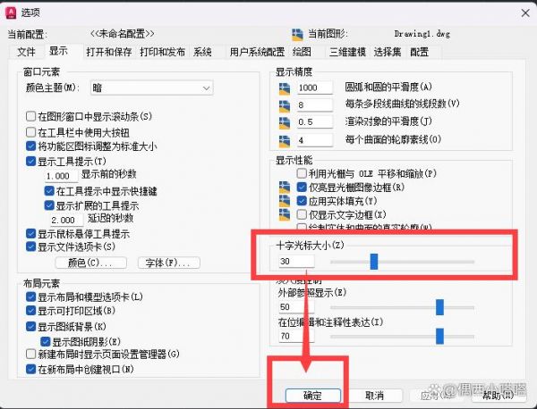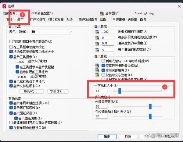 2、选项设置第二个显示选项卡,右侧可以看到十字光标大小,数字越大,光标越大,数字小则反之:
