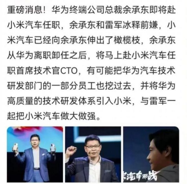 搞事不怕大 华为余承东将赴小米汽车任职的信息为不实