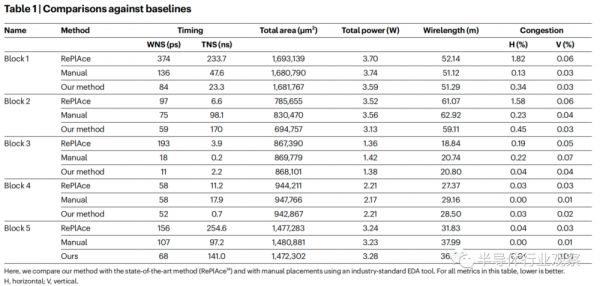 将谷歌的方法与最先进的方法(RePlAce14)以及使用行业标准EDA工具的手动放置进行比较。具体比较的指标有花费的时间、总的面积、功耗、线长等等,对于该表中的所有指标,越低越好。可以看出,谷歌的强化学习方法均优于其他两种。