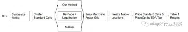 谷歌将芯片布局规划看作为一个强化学习(RL)问题,并开发了一个基于边缘的图卷积神经网络架构,能够学习芯片的丰富和可转移表示。具体的评估工作流程见图1。该流程允许每个方法访问相同的聚类网络列表超图,在所有方法中(尽可能地)使用相同的超参数。每种方法完成放置后(包括RePlAce的合法步骤),将宏捕捉到电网格中,冻结宏位置,并使用商业EDA工具放置标准单元并报告最终结果。