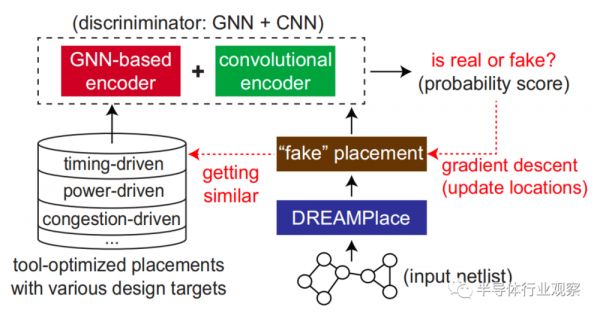 但是,由于其对线长和密度的关注有限,DREAMPlace的布局质量无法与商业工具相比,这使得它很难适用于工业设计流程。为了解决这一问题,英伟达科学家近日的一项研究文章中提出了一种新方法——DREAM-GAN,这是一种使用生成对抗学习推进 DREAMPlace的布局优化框架。DREAM-GAN的最大优势在于,它使DREAMPlace能够朝着工具验证(和优化)的方向优化底层位置,而无需明确了解商业工具的黑盒算法。DREAMPlace通过优化鉴别器的输出,提高了其商业化的位置。